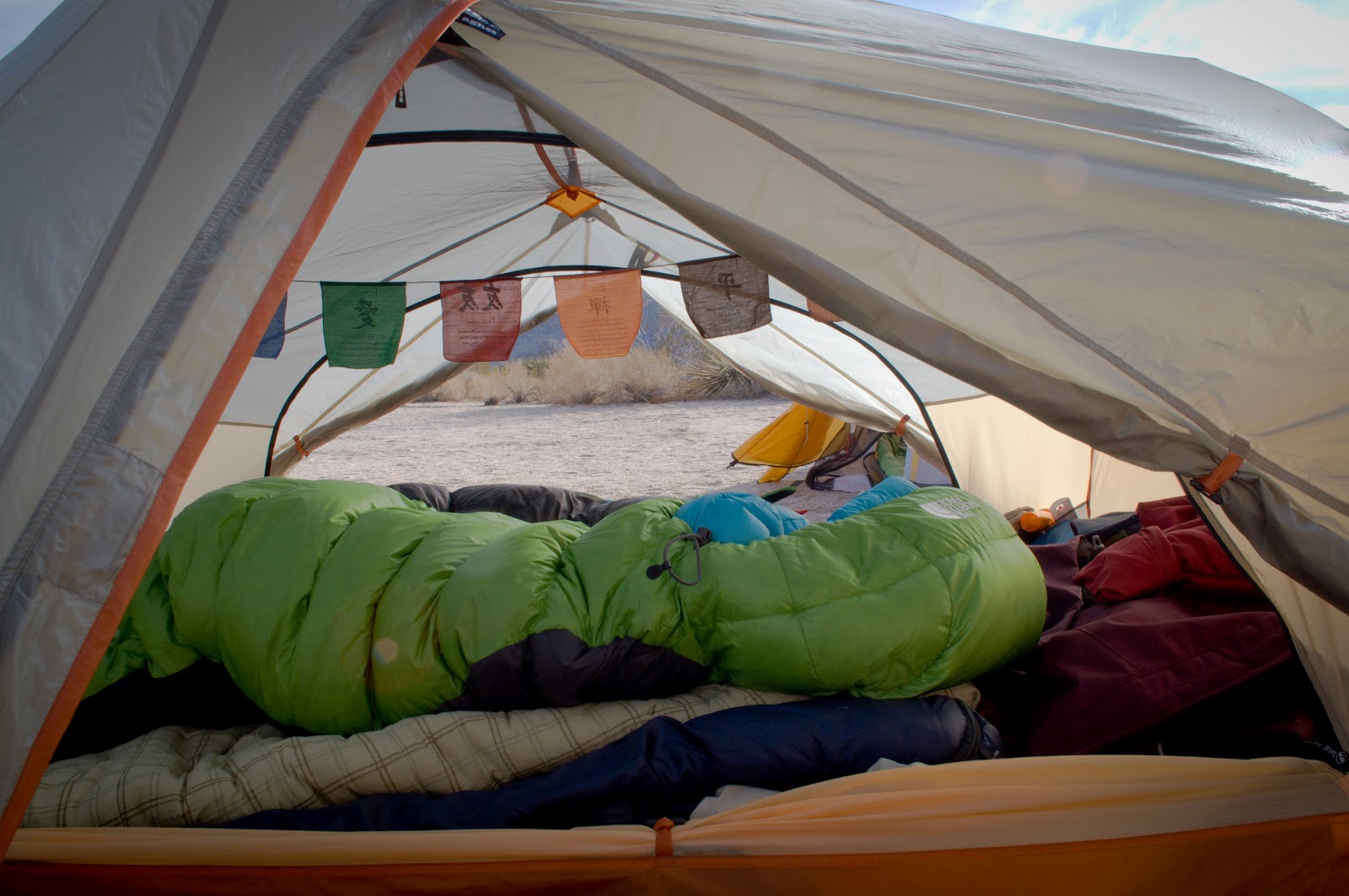 | Mom's Tibetan prayer flags always hanging in the tent now |